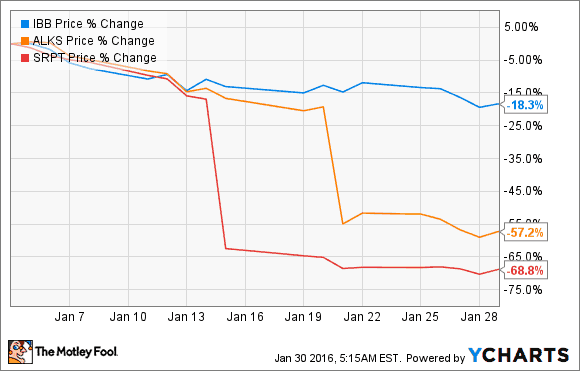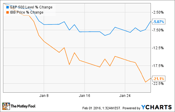 Biotech-Aktien haben das Jahr mit dem falschen Fuß begonnen (um es einmal euphemistisch auszudrücken). Während der S&P 500 etwas mehr als 5 % im Januar verloren hat, ist der iShares Nasdaq Biotechnology ETF (WKN:A1C4T1) laut Daten von S&P Capital IQ um schockierende 21 % gefallen.