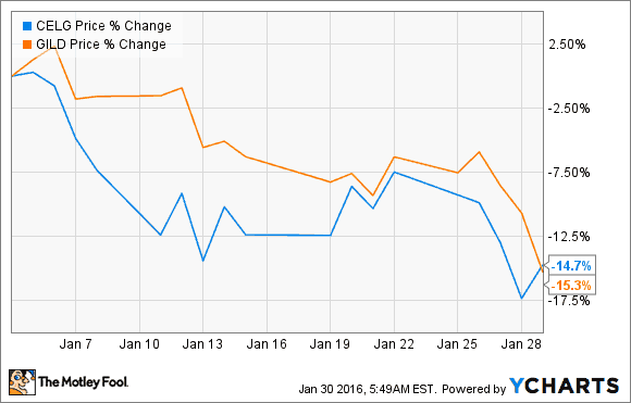 Leider konnten die Leitwölfe der Industrie wie Celgene (WKN:881244) und Gilead Sciences (WKN:885823) hier auch nicht helfen. Bei der JP Morgan Gesundheitskonferenz veröffentlichte Celgene einen schlechter als erwarteten Ausblick für 2016 und verpasste dann auch noch die Schätzungen des vierten Quartals aufgrund von weniger Umsätzen von Revlimid und den steigenden Kosten für Forschung und Entwicklung.