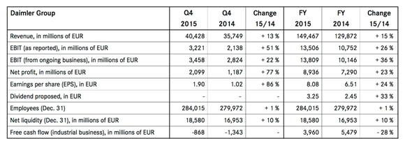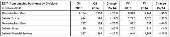 Das Mutterunternehmen von Mercedes-Benz, Daimler (WKN:710000), meldete am 4. Februar die Ergebnisse für das vierte Quartal und für das Geschäftsjahr 2015. Das Unternehmen erzielte in Q4 einen Gewinnzuwachs vor Steuern und Zinsen von 22 % (3,46 Milliarden EUR). Die Einnahmen stiegen um 13 % auf 40,4 Milliarden EUR.
