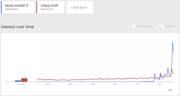 Man kann natürlich den neuen Chevy Bolt von General Motors (WKN:A1C9CM) mit dem Model 3 vergleichen und solange die beiden nur auf dem Papier existieren, sehe ich nur wenige Gemeinsamkeiten. Das Model 3 könnte meiner Meinung nach interessanter sein als der Bolt, der aber zuerst auf den Markt kommen soll. Hier kann man die aktuellen Suchtrends als einen Anhaltspunkt für das Kundeninteresse nehmen:
