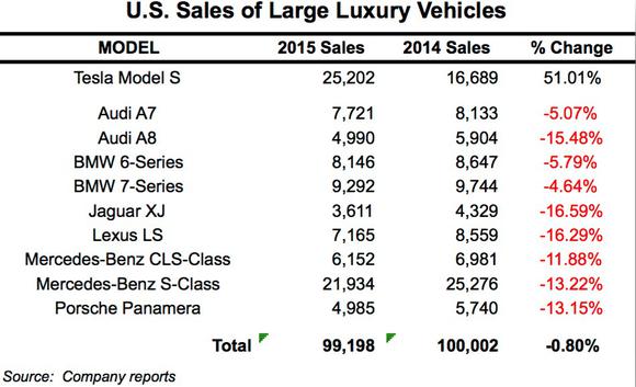 Bei einem Absatz von gerade einmal 50.000 Fahrzeugen im Jahr 2015 ist Tesla immer noch weit davon entfernt, ernsthaft mit den globalen Automobil-Riesen, deren Absatzzahlen sich alle samt im siebenstelligen Bereich befinden, konkurrieren zu können. Aber wie es Tesla selbstbewusst in seinem Aktionärsbrief zum Abschluss des vierten Quartals anmerkte, hat der US-Absatz der Model-S-Limousine die direkt vergleichbaren Limousinen der deutschen Automobilhersteller, die lange Zeit die Vorherrschaft auf dem globalen Luxusmarkt inne hielten, weit hinter sich gelassen.