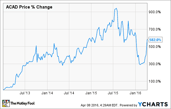 Ein Beispiel dafür ist Acadia Pharmaceuticals (WKN:603035). Acadias Aktie hat eine wilde Fahrt hinter sich, seit sein experimentelles Parkinson-Medikament Nuplazid 2013 positive Ergebnisse in späten Stadien aufweisen konnte.