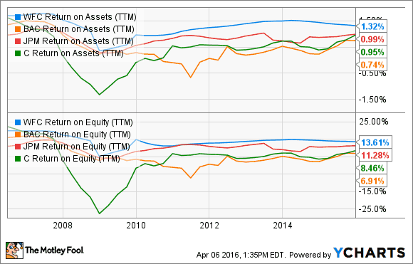 Sieh dir dazu nur mal die größte Position von Berkshire an. Wells Fargo (WKN:857949) hat in der Vergangenheit schon oft sein kluges Risikomanagement und seine Effizienz unter Beweis gestellt. Das hat es der Bank erlaubt, kontinuierlich mehr Gewinn zu machen als die anderen drei der „großen Vier“. Sieh dir nur die Vermögensrendite und die Eigenkapitalrendite in den letzten 10 Jahren an. Siehst du, wie die blauen Linien immer oben sind, in guten wie in schlechten Zeiten.