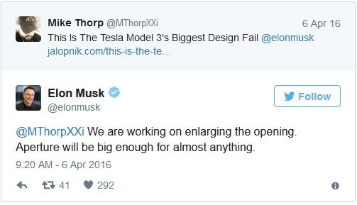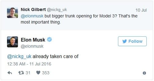 Tesla hatte zuvor schon angegeben, das Model 3 würde in weniger als 6 Sekunden von 0 auf 60 Meilen pro Stunde beschleunigen. Jetzt gibt es einige Einzelheiten dazu. Nach der Vorstellung Anfang 2016 gab es die Sorge, dass die Kofferraumklappe nicht gut aussehe, worauf Musk sagte, Tesla würde sich darum kümmern. Da das Model 3 etwa 30 cm kürzer ist als das Model S, wird das Model 3 auch weniger als die Hälfte des Kofferraumvolumens haben.