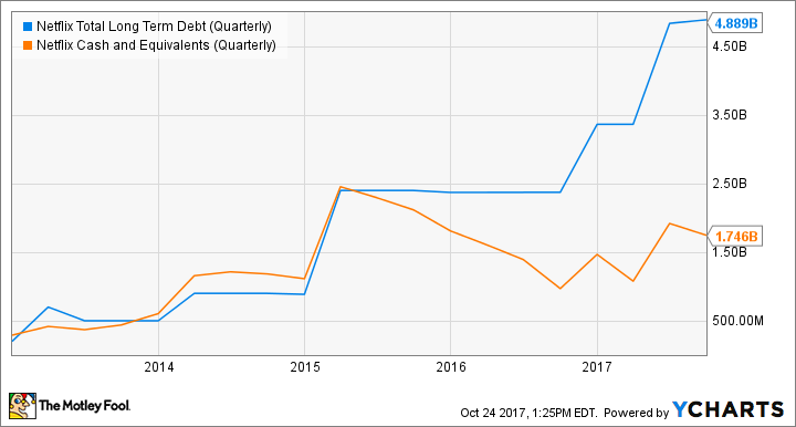 Die neuen Anleihen bedeuten, dass das langfristige Schuldenlevel von Netflix bei 33 % liegt, bei fast 6,5 Milliarden Dollar. Damit ist das frei verfügbare Cash auf das Doppelte nach oben geschnellt, rauf auf etwa 3,3 Milliarden. Das Unternehmen kann also quasi 1,6 Milliarden Dollar an den Verlauf beider Linien rechnen: