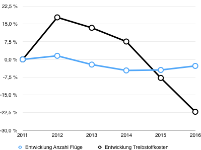 Der erste Auslöser für einen Kurssturz könnte ein stark steigender Ölpreis sein. Wie sehr der Ölpreis die Entwicklung der Lufthansa beeinflussen kann, verdeutlicht die nachfolgende Grafik. Während die Anzahl der Flüge annähernd gleich geblieben ist, sind die Treibstoffkosten infolge niedriger Ölpreise um 20 % gesunken.