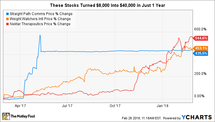 Dennoch ist es einigen Aktien gelungen, in relativ kurzer Zeit lebensverändernden Reichtum zu schaffen. Insbesondere ist eine ausgewählte Handvoll Aktien so stark gestiegen, dass aus einer anfänglichen Investition von 8.000 US-Dollar in nur einem Jahr mehr als 40.000 US-Dollar werden konnten. Heute werden wir uns Nektar Therapeutics (WKN:165417), Weight Watchers International (WKN:765375 ) und Straight Path Communications (WKN:A1W241) anschauen, um zu sehen, wie sie so starke Renditen erwirtschaftet haben und was für diese Unternehmen als Nächstes kommt.