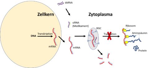 In Abbildung 2 wird die Wirkung von siRNA (small interfering RNA) gezeigt, die doppelsträngig in die Zelle gelangt und dort zu einem Einzelstrang abgebaut wird. Diese siRNA bindet dann an das passendes Gegenstück der mRNA im sogenannten RISC (RNA-induced silencing complex), an dem weitere Proteine beteiligt sind. Die mRNA wird dort zerschnitten und damit inaktiviert, sodass kein Protein daraus gebildet werden kann.
