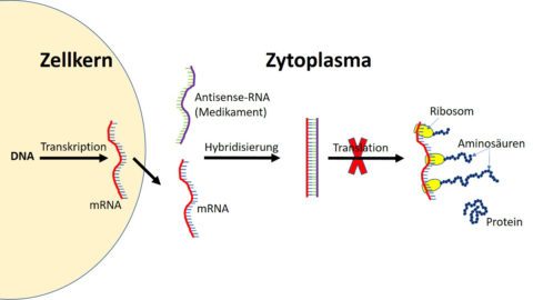 Heute gibt es grundsätzlich zwei Verfahren in der klinischen Entwicklung von Medikamenten, die im Folgenden kurz veranschaulicht werden. In Abbildung 1 bindet eine Antisense-RNA an die mRNA, sodass diese nun blockiert und damit nicht mehr von Ribosomen zur Proteinproduktion abgelesen werden kann. Nach Bindung der Antisense-RNA wird eine zelluläre RNAase aktiviert, die nun dieses Hybrid aus mRNA und komplementärem Antisense-Strang abbaut und damit inaktiviert.