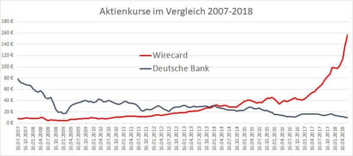 Während der akuten Finanzkrise ging es zunächst bei beiden bergab. Aber seither tendiert die eine weiter stur nach unten, während die andere einen Rekord nach dem anderen bricht. Heute ist Wirecard stolze 18 Mrd. Euro wert, während die Deutsche Bank, vor allem dank der massiven Eigenkapitalerhöhungen der letzten Jahre, mit 20 Mrd. Euro noch knapp die Nase vorn hat.