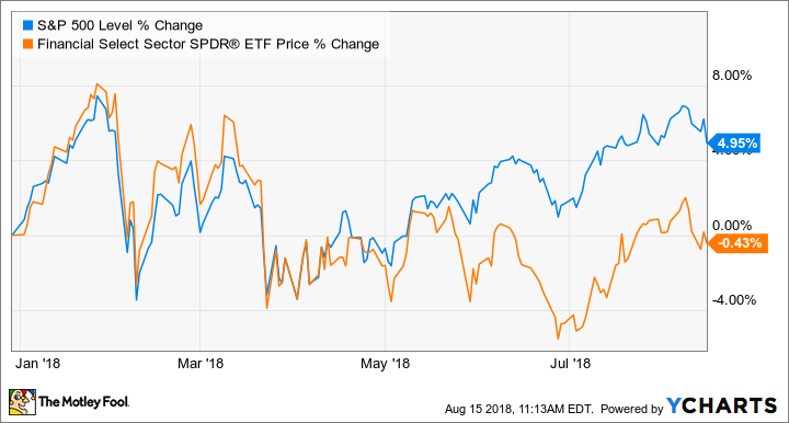 Wir wissen zwar nicht genau, warum Buffett (oder einer seiner Vertrauten) diese Investitionen getätigt hat, aber es könnte etwas mit der relativ schlechten Performance des Finanzsektors als ganzem zu tun haben. Bankaktien haben den S&P 500 im Jahr 2018 bisher um mehr als fünf Prozentpunkte unterschritten, und im zweiten Quartal gab es Zeiten, in denen die Differenz noch deutlicher ausfiel.