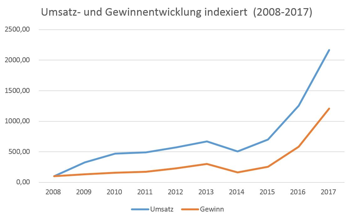 Vor dem Kursrückgang war sie übertrieben stark gestiegen, so dass sie meiner Meinung nach überbewertet war. So verbesserte sich der Gewinn in den letzten 10 Jahren etwa um 1.110 %, während der Kurs im gleichen Zeitraum um circa 5.000 % stieg. Seit November 2017 ist sie nun über 42 % (30.08.2018) gefallen, so dass sie auf dem aktuellen Niveau nicht mehr zu teuer, aber auch nicht stark unterbewertet ist.