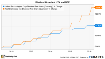 Sowohl United Technologies als auch NextEra scheinen sich erfolgreich in die Reihe der Dividendenaristokraten einzureihen, indem sie ihre Dividende 25 Jahre in Folge erhöhen konnten. United Technologies erscheint im Vergleich zu anderen aus der Branche relativ günstig. Die Übernahme von Rockwell Collins könnte noch einmal etwas mehr Wert generieren, ebenso die Gerüchte um eine Aufspaltung. NextEra Energy ist etwas, nun, unspektakulärer, hat klar definierte Pläne für Investitionen in regulierte Anlagen und auf Seiten erneuerbarer Energien. Mit einem Ziel von 12 % bis 14 % an jährlichem Dividendenwachstum bis zum Jahr 2021 ist die Aktie für Freunde von Dividendenwachstum aber durchaus lohnenswert.