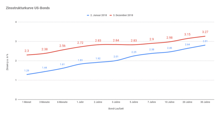 Wie du vielleicht weißt, hat die Fed, also die US-Zentralbank, über die letzten Quartale regelmäßig die Zinsen angehoben, um einem Überhitzen der Wirtschaft entgegenzuwirken und perspektivisch zur geldpolitischen Normalität zurückzukehren. Im obigen Chart sieht man ja auch schön, dass die Renditen am kurzen Ende heute rund 1 % höher stehen als noch zu Jahresanfang.