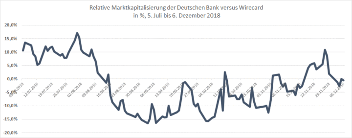 Es war schon beeindruckend, wie Wirecard rund um den DAX-Aufstieg im September immer neue Rekorde markierte. Zwischenzeitlich war der Zahlungsdienstleister über 15 % mehr wert als die Deutsche Bank, wie die folgende Grafik, die die Marktkapitalisierung der Deutschen Bank prozentual mit derjenigen von Wirecard vergleicht, zeigt: