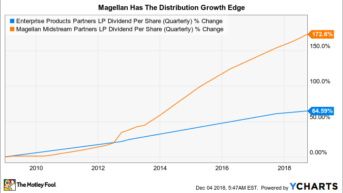 Besonders interessant an Magellan ist auch, dass es sich seit langem auf die Eigenfinanzierung konzentriert. Anders gesagt: Enterprise verändert im Wesentlichen sein Geschäftsmodell, um mehr wie Magellan sein zu können. Allerdings gibt es einen bemerkenswerten Unterschied: Magellan hat die Anleger besser belohnt, wenn es um die Steigerung der Ausschüttung geht. Während Enterprise ein niedriges einstelliges Ausschüttungswachstum anstrebt, erwartet Magellan bis 2020 ein Ausschüttungswachstum von 5 % bis 8 % pro Jahr. Auch darum ist die Rendite von Magellan etwas niedriger: Investoren neigen dazu, einen Schwerpunkt auf das Ausschüttungswachstum zu legen.
