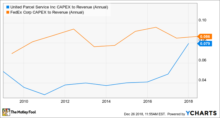 Obwohl erhöhte Investitionsausgaben über ein paar Jahren hinweg langfristige Investoren wie Buffett nicht abschrecken, ist es alles andere als klar, dass der Anstieg nicht die neue Normalität sein wird. Wie du in der folgenden Grafik sehen kannst, hat FedEx beispielsweise konsequent Investitionen in Höhe von etwa 8 bis 10 % des Umsatzes getätigt, und UPS könnte sich gezwungen sehen, das langfristig ebenfalls tun zu müssen.