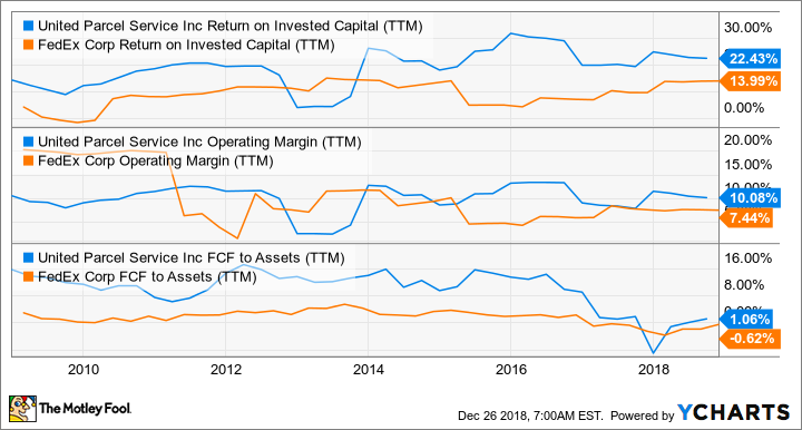 Darüber hinaus zeigt ein kurzer Vergleich einiger operativer Kennzahlen mit FedEx, dass UPS tendenziell eine höhere operative Marge hat, höhere Renditen auf das investierte Kapital erzielt und auch mehr freien Cashflow aus seinen Vermögenswerten generiert als sein Hauptkonkurrent.