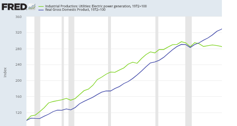 Diese Entwicklung ist in der folgenden Grafik sehr deutlich zu erkennen, die das Wachstum der US-Stromerzeugung (grüne Linie) mit dem des realen Bruttoinlandsprodukts (blaue Linie) vergleicht:
