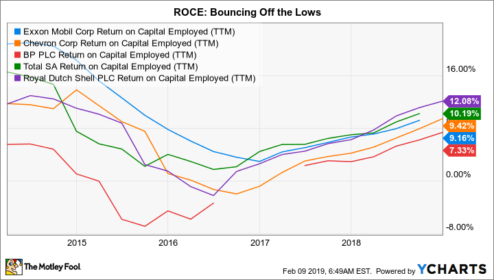 Viele Jahre lang tendierte Exxon dazu, im ROCE-Bereich im oberen Preissegment zu liegen. Nach der tiefen Ölbaisse, die Mitte 2014 begann, rutschte man jedoch ins Mittelmaß ab. Dort dümpelt man noch immer. Exxon hat jedoch ein umfangreiches Investitionsprogramm gestartet, das Anfang 2017 ausführlich erläutert wurde. Ziel ist es, das Ergebnis bis 2025 mehr als zu verdoppeln, wenn der Ölpreis bei rund 60 USD pro Barrel bleibt.