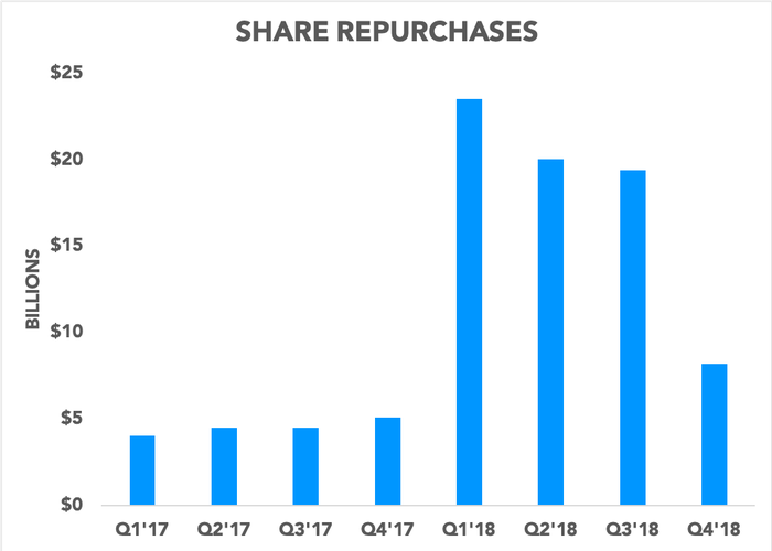 Apple hat sich 2019 wieder erholt, auch nachdem das Unternehmen das Jahr mit einer umfassenden Überarbeitung des Ausblicks begonnen hatte, wobei das Unternehmen mehrere wichtige Herausforderungen im Kerngeschäft iPhone benannt hat. Apple hatte auch im vierten Quartal seinen Aktienrückkauf drastisch reduziert, was zum Teil auf die im Vergleich zu den früheren Prognosen rückläufigen Umsätze zurückzuführen war.