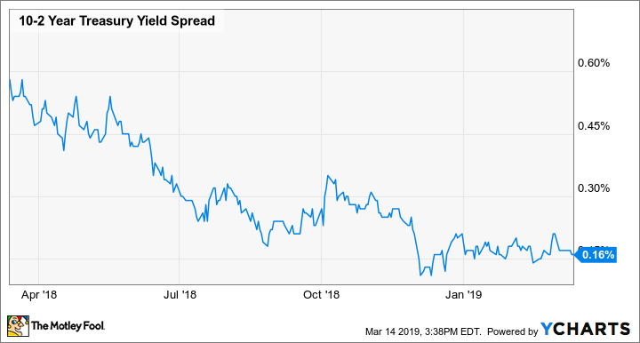 10-2 Jahre Staatsanleihen-Rendite-Spread. Daten von YCharts.