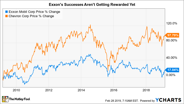 Die Produktion ist indes nicht so schlecht, wie sie aussieht. Die ersten Ergebnisse aus nur einem der wichtigsten Wachstumsprojekte des Unternehmens beginnen bereits, weiter zu steigen. Die Expansion im Onshore-Ölbohrsegment in den USA trug dazu bei, dass das Unternehmen die Produktion zwischen dem zweiten und dritten Quartal 2018 steigern konnte. Auch zwischen dem dritten und vierten Quartal gab es einen weiteren Anstieg. Das reichte natürlich nicht aus, um den Rückgang des Gesamtjahres auszugleichen, aber es zeigt, dass sich die Produktion von Exxon wieder in die richtige Richtung bewegt.