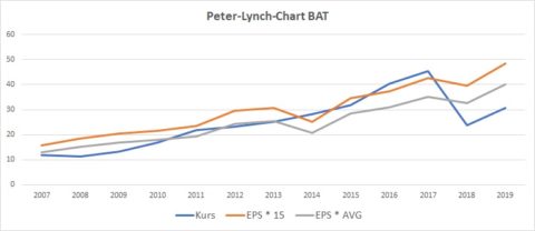 Bei British American Tobacco sieht man sehr schön die Vorbehalte gegenüber der Tabakindustrie. Im Betrachtungszeitraum wird das Unternehmen durchschnittlich mit einem KGV von 12,4 gehandelt. Bis 2017 folgte der Aktienkurs stets einem der beiden Graphen. 2018 hat der Aktienkurs diese beiden Kurven deutlich verlassen und bietet aktuell 25 % Potenzial bis zur Linie mit dem historischen KGV und 38 % bis zur Linie von Peter Lynch.