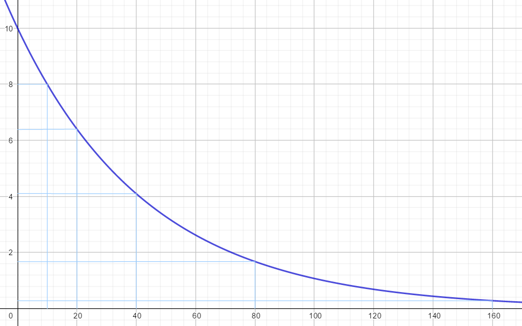 Hier habe ich eine Abnahme von 20 % gewählt: Nach zehn produzierten Einheiten sind die Kosten von 10 auf 8 gefallen, nach 20 Einheiten auf 6,20, nach 40 Einheiten um weitere 20 % und immer so weiter. Die hellblauen Linien, die ich bei zehn, 20, 40, 80 und 160 insgesamt produzierten Einheiten platziert habe, verdeutlichen dir die genannten Stellen.