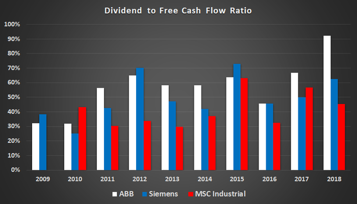 Wie man in der folgenden Grafik sieht, erntet ABB nur Kopfschütteln, und das Dividenden-FCF-Verhältnis von Siemens deutet nicht darauf hin, dass hier noch Platz für Wachstum wäre. Aber die Dividende von MSC scheint gut gedeckt.