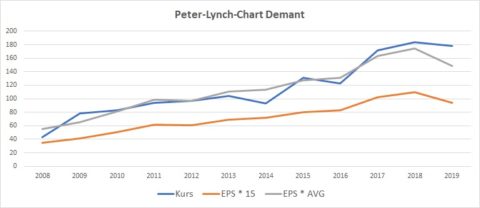 Bei Demant ist die Gewinnentwicklung im Betrachtungszeitraum schon fast wie mit dem Lineal gezogen. Ein Schnäppchen war die Aktie dadurch allerdings nie und so muss man sich bei der Bewertung eher am historischen KGV orientieren. Hier wäre der ideale Einstiegszeitpunkt 2014 gewesen. Auf den aktuellen Gewinnrückgang, der zu einem großen Teil durch einen Cyberangriff verursacht wurde, hat der Aktienkurs nur geringfügig reagiert. Die Idee hinter einem aktuellen Einstieg wäre die Chance, eine Gewinnnormalisierung im Jahr 2020 zu nutzen, wonach der aktuelle Kurs mindestens fair wäre bzw. sogar eine leichte Unterbewertung darstellen würde.