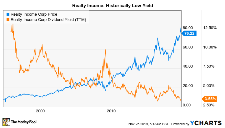 So liegt die Rendite der Aktie heute beispielsweise bei rund 3,5 %. Das sind volle 1,5 Prozentpunkte mehr als die rund 2 %, die man von einem börsengehandelten S&P 500 Fonds erhalten würden. Das gehört aber auch zu den niedrigsten Renditen, die je für die Aktie von Realty Income erzielt wurde. Die Kehrseite davon, dass sich Aktienkurs und Rendite in entgegengesetzte Richtungen bewegen, ist, dass der Aktienkurs nahe an seinen höchsten Niveaus in der Geschichte liegt.