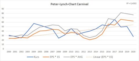Bei Carnival ist die Gewinnstabilität mit einem R² von 0,45 wesentlich geringer. Der Gewinnverlauf zeigt sich sehr wellig, mit Jahren der positiven- und negativen Abweichung vom Mittelwert. Langfristig traue ich dem Unternehmen eine Rückkehr zu diesem Mittelwert zu, weshalb ich das Unternehmen bereits als unterbewertet ansehen würde. Aufgrund der historisch unstetigen Entwicklung und der aktuell unsicheren Lage würde ich vor einem Kauf allerdings noch mit einem Modell prüfen, welches die Cashflows abzinst.