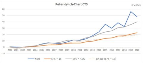 Das R² von 0,95 zeigt die absolute Stabilität im Gewinnwachstum von CTS. Daher kann ich nachvollziehen, warum der Markt dem Unternehmen beim durchschnittlichen KGV einen Aufpreis zugesteht. Allerdings ist es in den letzten Jahren zu einer Übertreibung gekommen, welche aktuell erst wieder zum Teil abgebaut wurde. Ab 40 Euro kann man sich in meinen Augen detaillierter mit der Aktie beschäftigen.