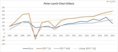 Um einen schnellen Überblick über die aktuelle Bewertung des Unternehmens zu erhalten, verwende ich das Peter-Lynch-Chart. Hier stellt man dem Aktienkurs den 15-fachen Gewinn je Aktie gegenüber. Ist die Kurslinie höher als die Gewinnlinie, scheint die Aktie eher überbewertet zu sein, und umgekehrt.