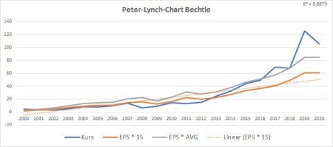 Bei Bechtle ist die Entwicklung mit einem R² von 0,89 fast genauso beeindruckend. Die Entwicklung der Gewinne war in den letzten Jahren ebenfalls sehr positiv. Die Aktie hat sich allerdings noch stärker als die Gewinne des Unternehmens entwickelt. Trotz des Kurssturzes im Zuge von Corona ist die Aktie noch sehr sportlich bewertet. Im Bereich von ca. 80 Euro könnte man sich in meinen Augen intensiver mit dem Unternehmen auseinandersetzen.
