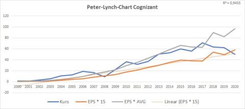 Das R² von 0,95 zeigt, wie stabil sich der Gewinn von Cognizant in den letzten Jahren entwickelt hat. Zuletzt hat sich die Entwicklung sogar eher beschleunigt. Dabei wurde die Aktie auch wesentlich durch konsequente Rückkäufe gestützt. Zuletzt wurde bei der Bekanntgabe der Zahlen für das Jahr 2019 ein weiteres Rückkaufprogramm über 2 Mrd. US-Dollar verkündet. Der Chart zeigt, dass sich aktuell die seltene Möglichkeit ergibt, unter der Linie für den 15-fachen Gewinn einzusteigen. Zuletzt gab es diese Chance bei der Finanzkrise 2008.