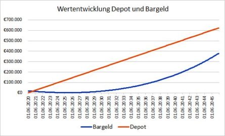 Als Ausgleich für die Annahme der regelmäßigen Dividendensteigerungen verzichtet das Modell auf jegliche Kurssteigerungen. Auch so erreichen wir unser Ziel: Im Mai 2046, also in ziemlich genau 26 Jahren, wären wir mit diesem einfachen System Millionäre, mit einem stolzen Depot in Höhe von 624.000 Euro und einem prallen Sparstrumpf von 380.000 Euro.