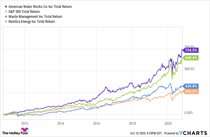 Das Müllabfuhrunternehmen Waste Management (WKN:893579), Wasserversorgungsunternehmen American Water Works (WKN:A0NJ38), zusammen mit dem Elektrizitätsunternehmen NextEra Energy (WKN:A1CZ4H) haben den Markt in den letzten zehn Jahren übertroffen. Diese Unternehmen setzen ihre Investoren einem relativ geringen Risiko aus, da sie Dienstleistungen anbieten, die für das tägliche Leben von Millionen von Menschen unerlässlich sind. Während dieser Must-Have-Status sie zu sichereren Investitionen macht, hat jedes dieser Unternehmen auch einen langen Wachstumspfad vor sich – schließlich werden wir Wasser, Müllabfuhr und Elektrizität für eine sehr lange Zeit benötigen.