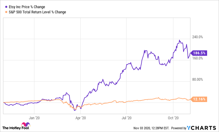 DER JAHRESAKTUELLE AKTIENCHART FÜR ETSY UND S&P 500 BIS 3. NOVEMBER 2020. ETSY DATEN VON YCHARTS