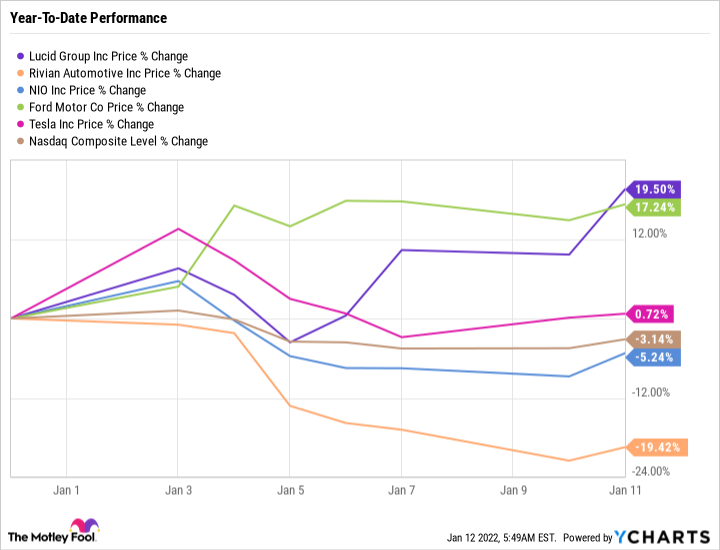 Nachdem sie im Jahr 2021 für Furore gesorgt hat, hat die Elektrofahrzeugbranche auch im Jahr 2022 keine Zeit verschwendet, um sich einen Namen zu machen. Obwohl der Nasdaq Composite in diesem Jahr im Minus liegt, haben die Aktienkurse der Lucid Group (WKN: A3CVXG) und der Ford Motor Company (WKN: 502391) bereits um jeweils über 17 % zugelegt, da die Investoren Investitionen in Elektrofahrzeuge und beschleunigte Produktionsziele bejubeln.