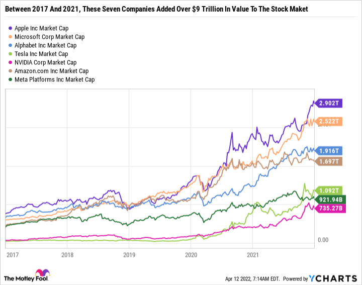 Es gibt Grund zu der Annahme, dass die Marktphase, in der wir uns jetzt befinden, diesem alternden Veteranenteam ähnelt. Bedenke, dass am 1. Januar 2017 der Wert von Microsoft ( WKN:870747 -2,41 % ), Apple (WKN:865985 -2,78 % ), Alphabet (WKN:A14Y6F -4,26 % )(WKN:A14Y6H -4,15 % ), Amazon (WKN:906866 -2,66 % ), Tesla ( WKN:A1CX3T -0,37 % ), Meta Platforms (WKN:A1JWVX-2,11 % ) und Nvidia ( WKN:9189422 -3,31 % ) zusammen 2,4017 Billionen US-Dollar betrug. Am 1. Januar 2022 betrug der Wert von Microsoft allein 2,522 Billionen US-Dollar – mehr als die sieben Unternehmen zusammen nur fünf Jahre zuvor.