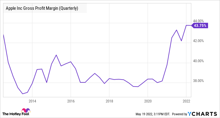 Ein weiterer Vorteil eines boomenden Dienstleistungssegments ist, dass diese Einheiten oft höhere Gewinnspannen erzielen. Apples Dienstleistungssegment weist eine Bruttomarge von 72,6 % auf, die deutlich höher ist als die Bruttomarge des Produktsegments von 36,4 %. Wie in der folgenden Grafik zu sehen ist, hat die höhere Bruttomarge des Dienstleistungsgeschäfts die Gesamtbruttomarge von Apple hoch getrieben.